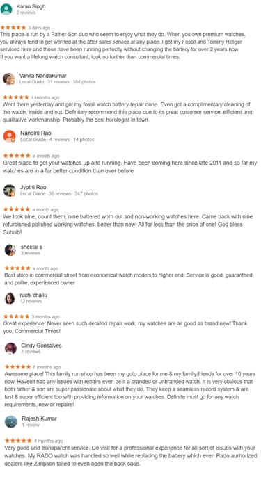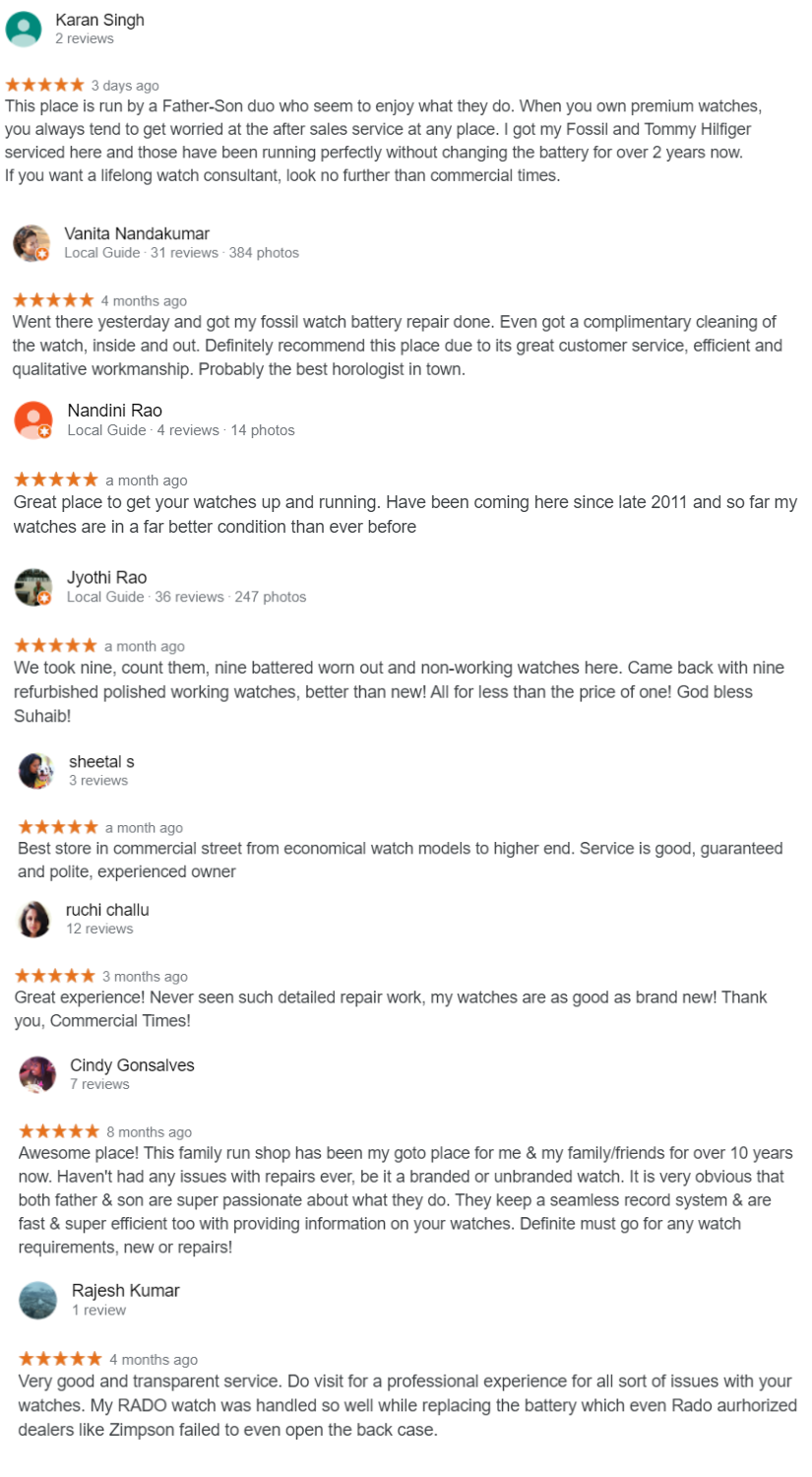 ‘I am the Fourth Generation in this business of Horology. Sales and service of watches has been in the family for over 100 YEARS. We have a team of technicians who have different specialisations , wherein we assign the jobs to them based on their specialisation. We Fix all brands, you name it we fix it. Servicing of premium watches is our specialty, from servicing a Rolex or an Omega to fixing batteries to a Rado or a Fossil, we personally do the job right in front of the customer with the highest possible level of transparency. We do undertake service of other designer brands as well as regular brands, which includes repairs of China watches too’.